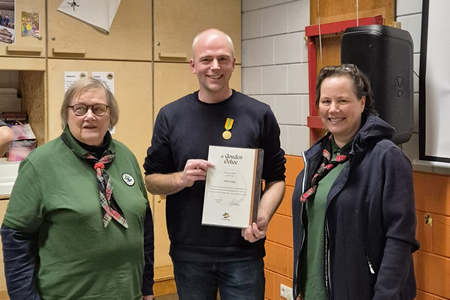 Tijdens de nieuwjaarsbijeenkomst van Scouting Sint Joris is Stefan in het zonnetje gezet door Astrid en Corine. Zij verrasten hem met de uitreiking van de Gouden Oehoe, een waarderingsteken van Scouting Nederland.
